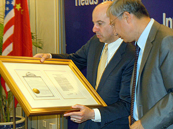 On May 29, 2012, United States Patent and Trademark Office Director David Kappos presented Chinese State Intellectual Property Office Commissioner Tian Lipu in Beijing with a commemorative copy of Dr. Jin Fuey Moy's patent for a nutcracker attachment. It is believed to be the first application ever received by USPTO from a subject of the Emperor of China. An entry about this patent was published in Mark Allen Cohen's China IPR blog in January 2012. You can read it here. Photo courtesy of Mark Allen Cohen.